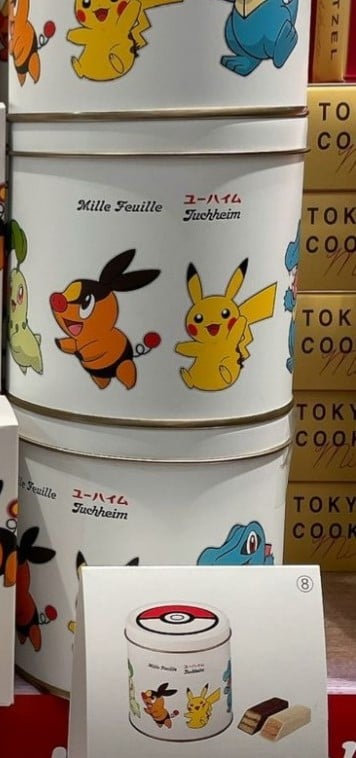 サクサクのパイにクリームをサンドして、チョコレートでコーティングしたミルフィーユをデザイン缶に入れました。個包装のデザインはピカチュウ、チコリータ、ポカブ、ワニノコの4種類。