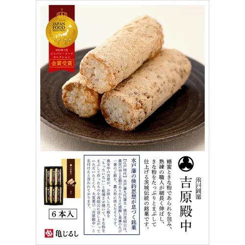 亀じるし龜印吉原殿中6入裝 水戶藩藩主德川齊昭,為感謝農民辛勞,每日都會將第一口飯供奉給「農人形」。後來,侍女吉原將供奉過的飯粒曬乾烘烤,再裹上黃豆粉,製成這款點心。齊昭公非常喜歡,並將其命名為「吉原殿中」。 🌟 製作工藝 🌟 ▫️ 將米果裹上糖蜜和黃豆粉 ▫️ 熟練工匠手工拉伸成細長形狀 ▫️ 再均勻裹上滿滿的黃豆粉 ▫️ 即使現代機械化發達,這款點心仍無法機器生產,全靠職人手作 ✅ 全手工製作:傳承百年技藝,每根都充滿溫度 ✅ 天然原料:只有糖蜜、黃豆粉和米,簡單純粹 ✅ 溫和甜味:黃豆粉香氣突出,甜度適中 ✅ 鋁箔包裝:完美保存點心的新鮮度和脆度 ✅ 全齡適用:從小朋友到長輩都能安心享用 💰價錢: 💲100 供應商隨時會更改價錢 下單前請先向我們查詢最新價錢 一切以下單時價格作準 ⏰截單日: 可長訂直到停產或者缺貨 🔜預計約4星期到貨 https://wewevavashop.boutir.com/ Signal GP: https://signal.group/#CjQKIIF0P55YCI4Kef_pVtjNtvtF3Gq4oWfho-rHH_I3XXbJEhADb-ff7TRQQicPixYt-Y1w Whatsapp GP: https://chat.whatsapp.com/Kk0DaE1nYKcGSP2SaNhO2h MEWE page: http://mewe.com/i/wewevavashop Facebook page: https://www.facebook.com/Wewe-Vava-Shop-102426269175059 HKBidding: https://www.hkbidding.com/store/wewe-vava-shop/