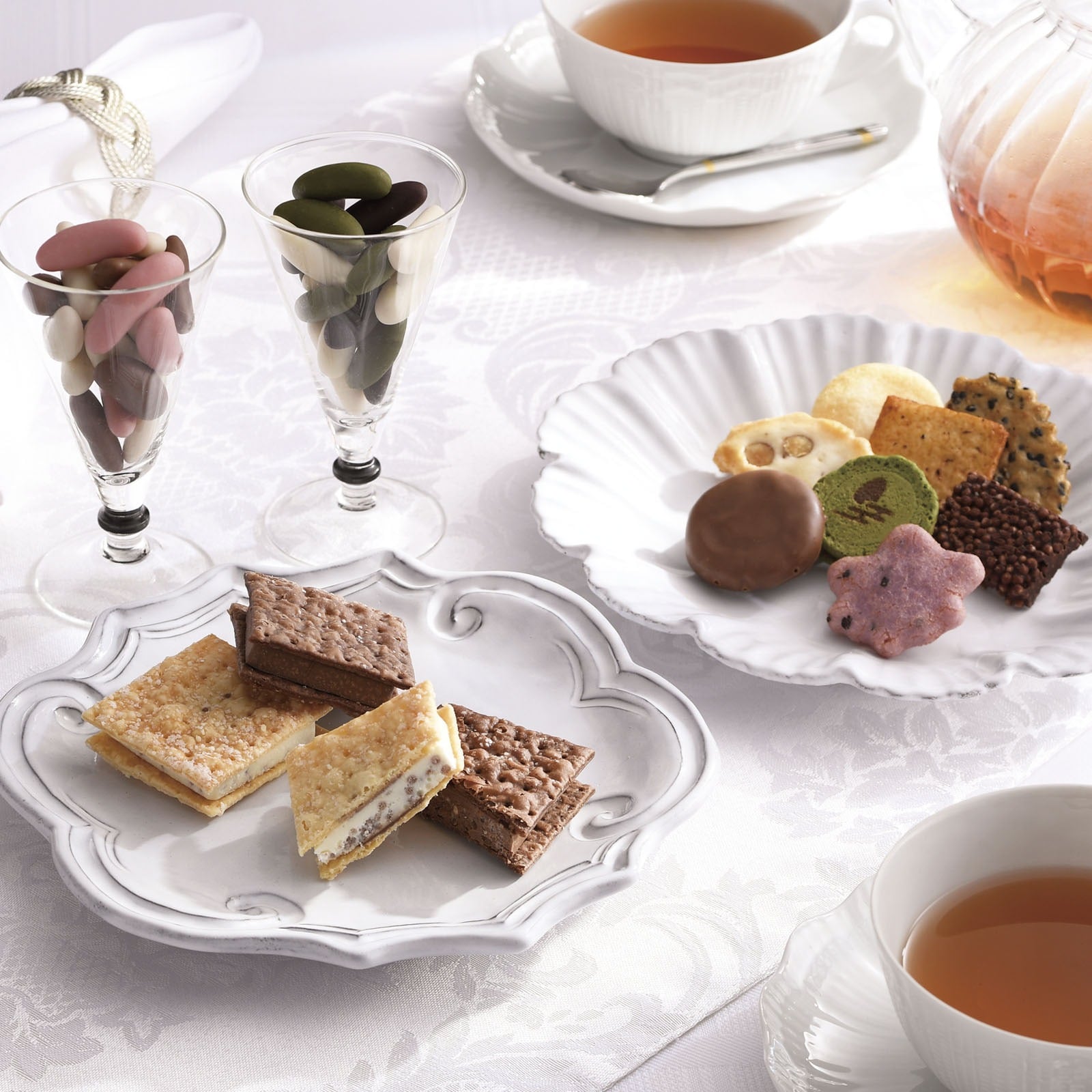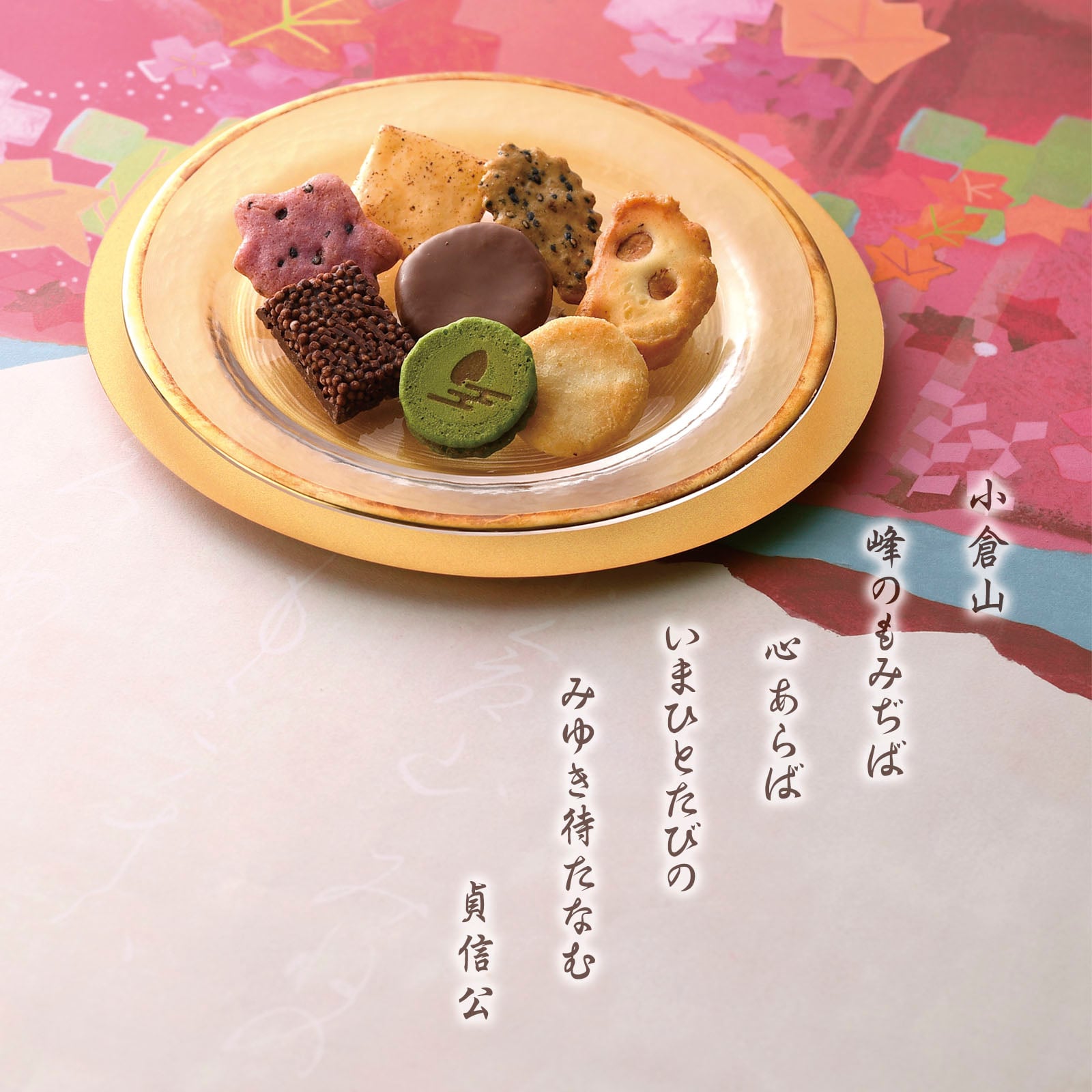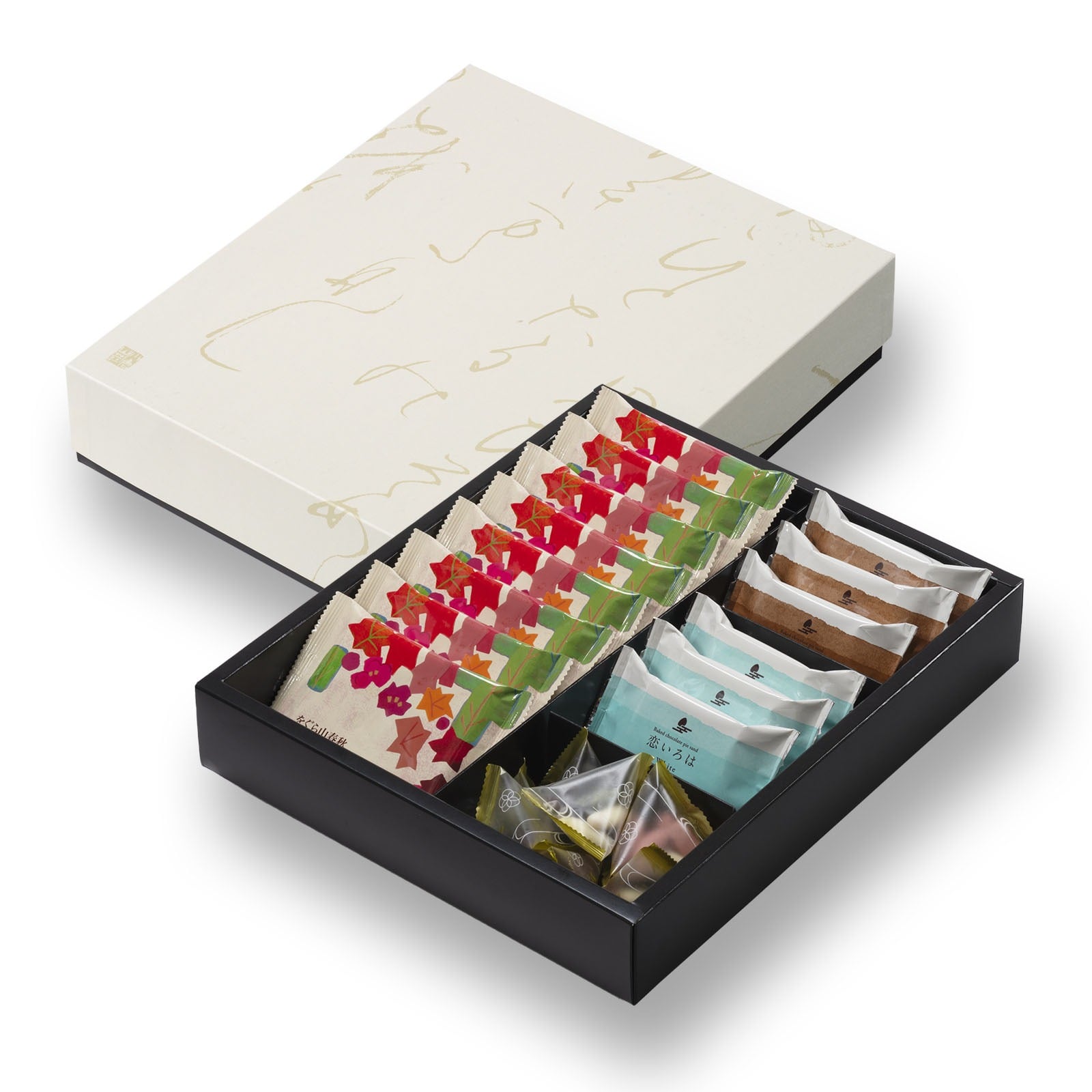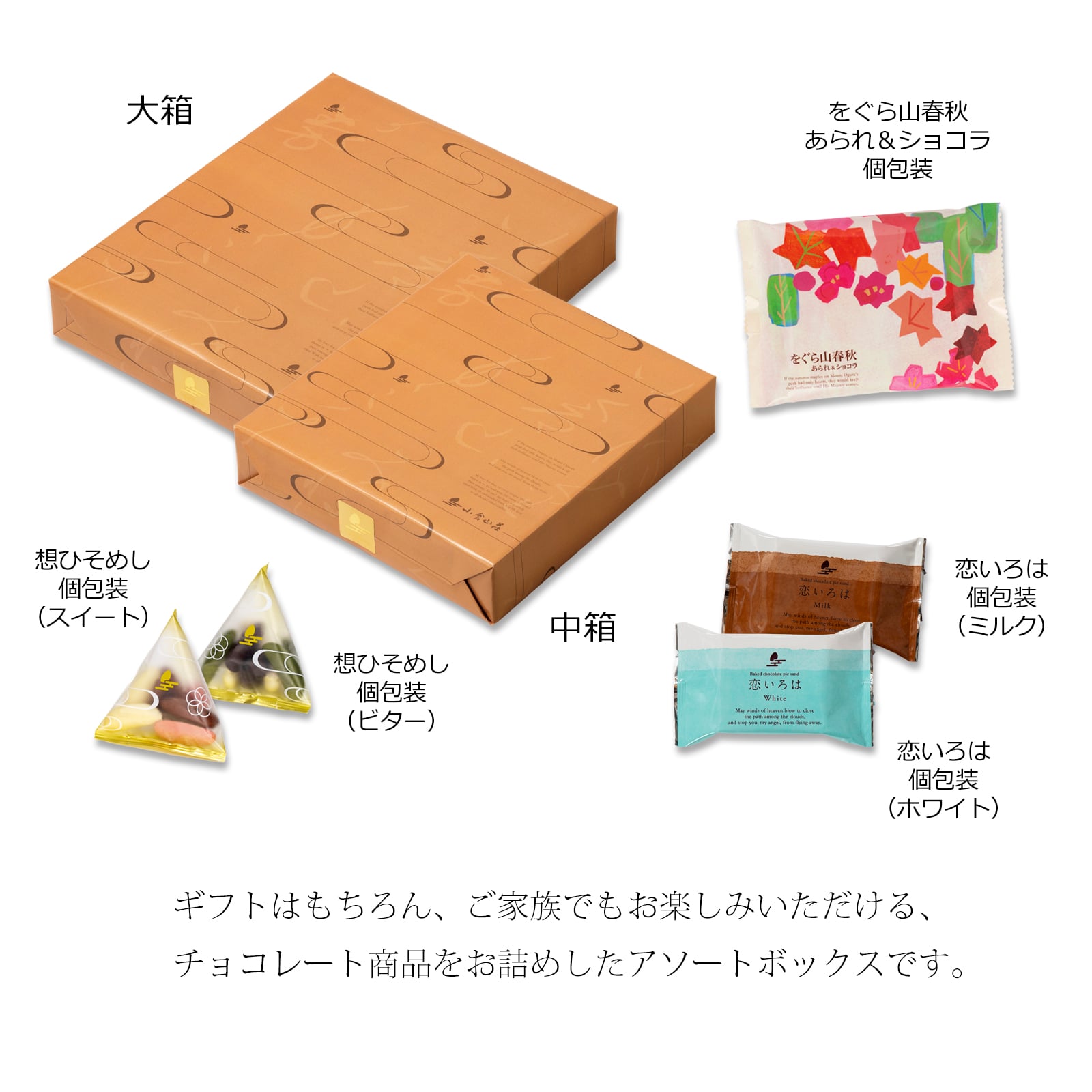 米菓&チョコのコラボレーション「をぐら山春秋 あられ&ショコラ」とチョコあられ「想ひそめし」、焼きチョコパイサンド「恋いろは」の3種をセットにしたアソートボックスです。