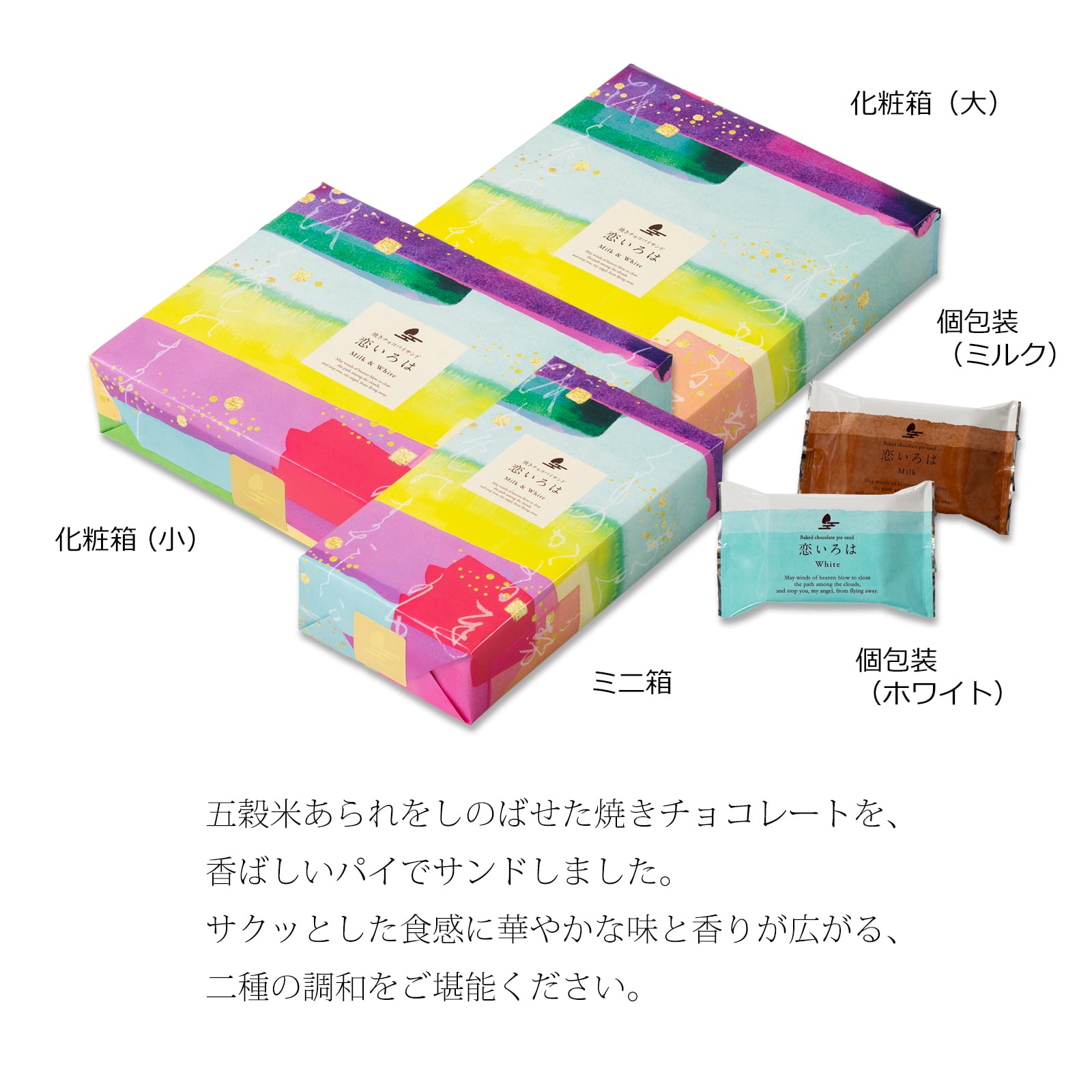 焼きチョコパイサンド「恋いろは」は、五穀あられを散りばめた口当たりの軽い焼きチョコレートを、表面に粉糖掛けし、香ばしく焼き上げたパイでサンドした、サクサクとした口あたりのチョコレート菓子です。濃厚なホワイトチョコレートの焼きチョコをサンドした「ホワイト」、ココアのパイに優しい甘さのミルクチョコレートの焼きチョコをサンドした「ミルク」、2種のお味をお楽しみいただけます。