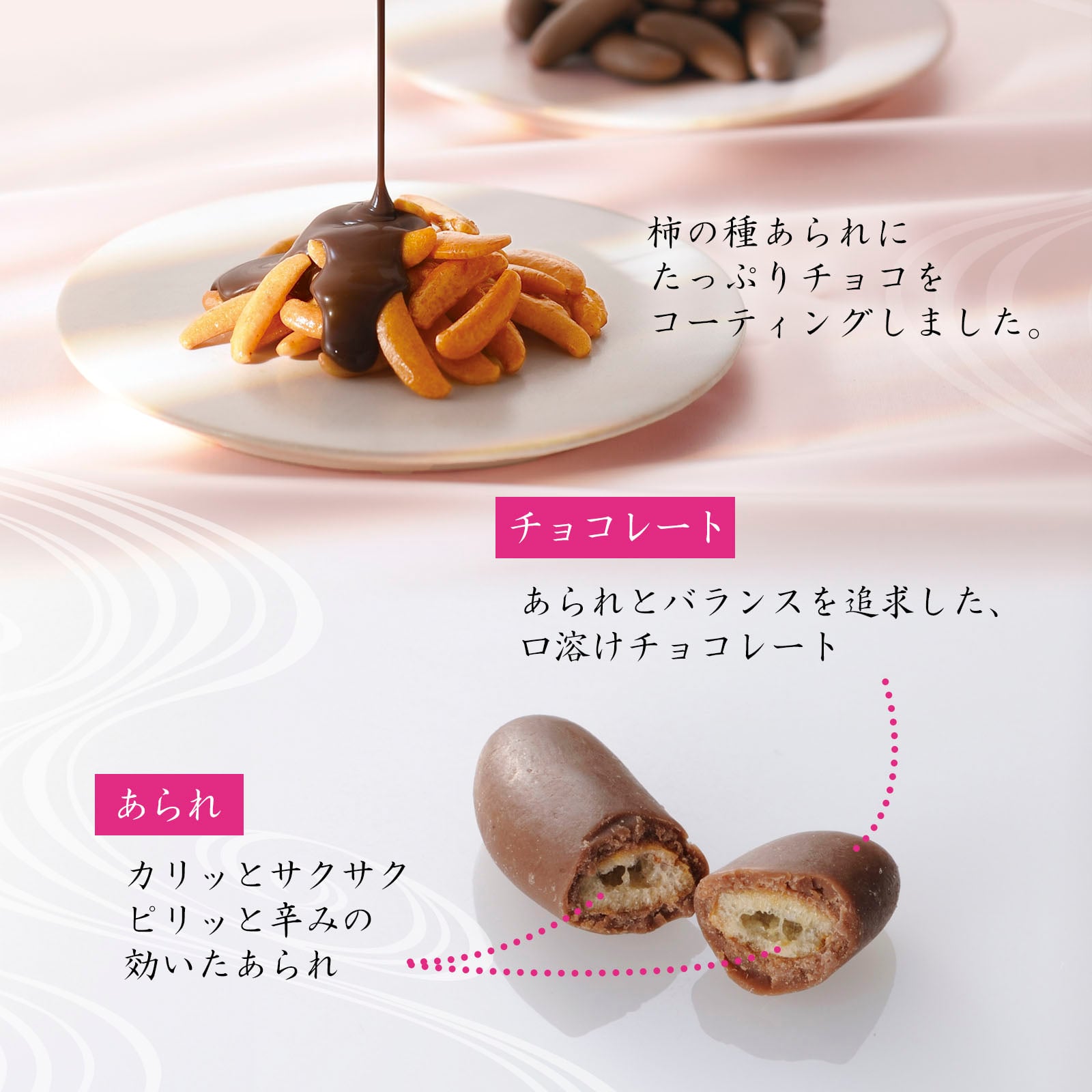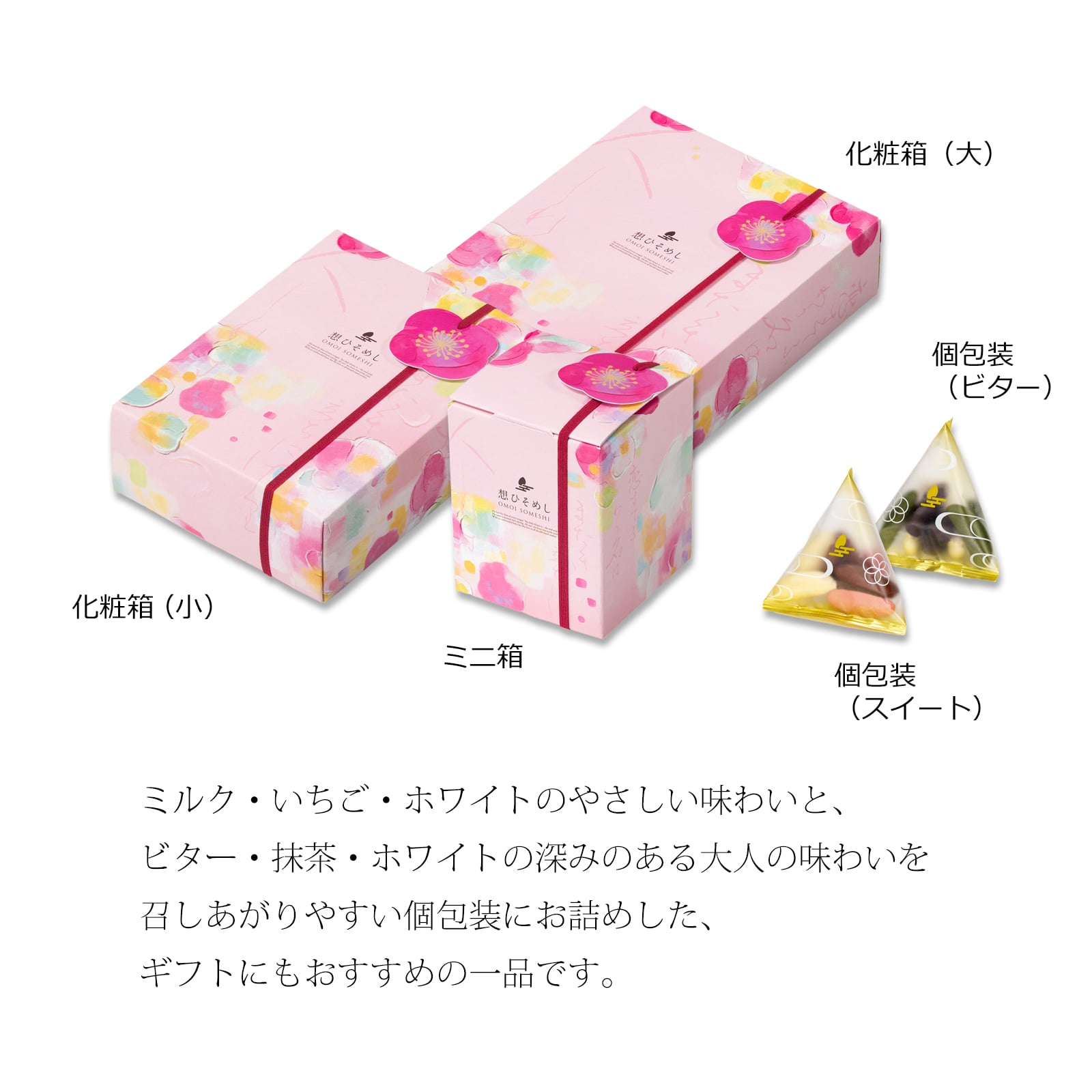 柿の種をチョコレートで包みこみました。ミルク・いちご・ホワイトのやさしい味わいと、ビター・抹茶・ホワイトの深みのある大人の味わいを召しあがりやすい個包装にお詰めした、ギフトにもおすすめの一品です。