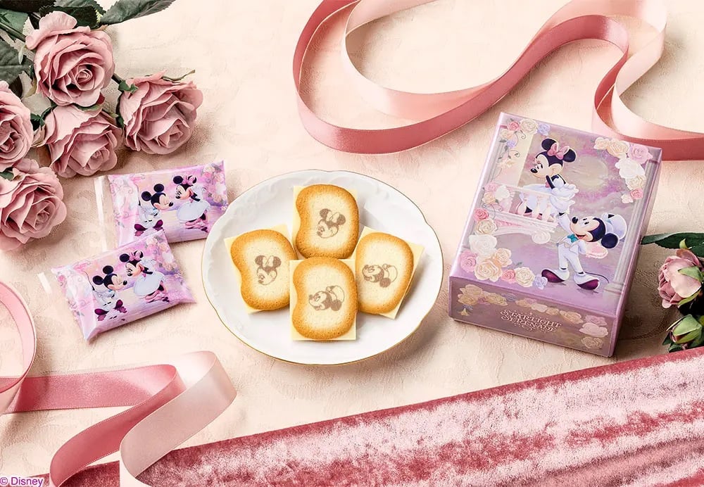 バラ色の星空を舞台にした、『スターライトセレナーデ/ショコラサンド「見ぃつけたっ」』。10枚入ボックスは、星をあつめたハートを「ミニーマウス」に贈る「ミッキーマウス」を描いたスペシャルデザイン。愛溢れる2人の雰囲気を、パール加工で月明かりに照らされているように上品な輝きが包み込みます。