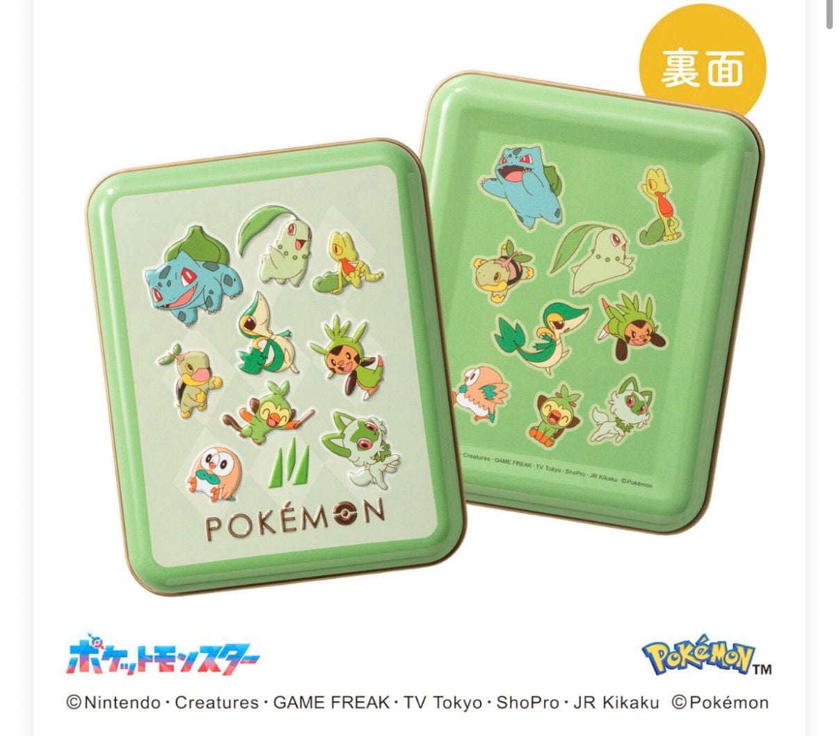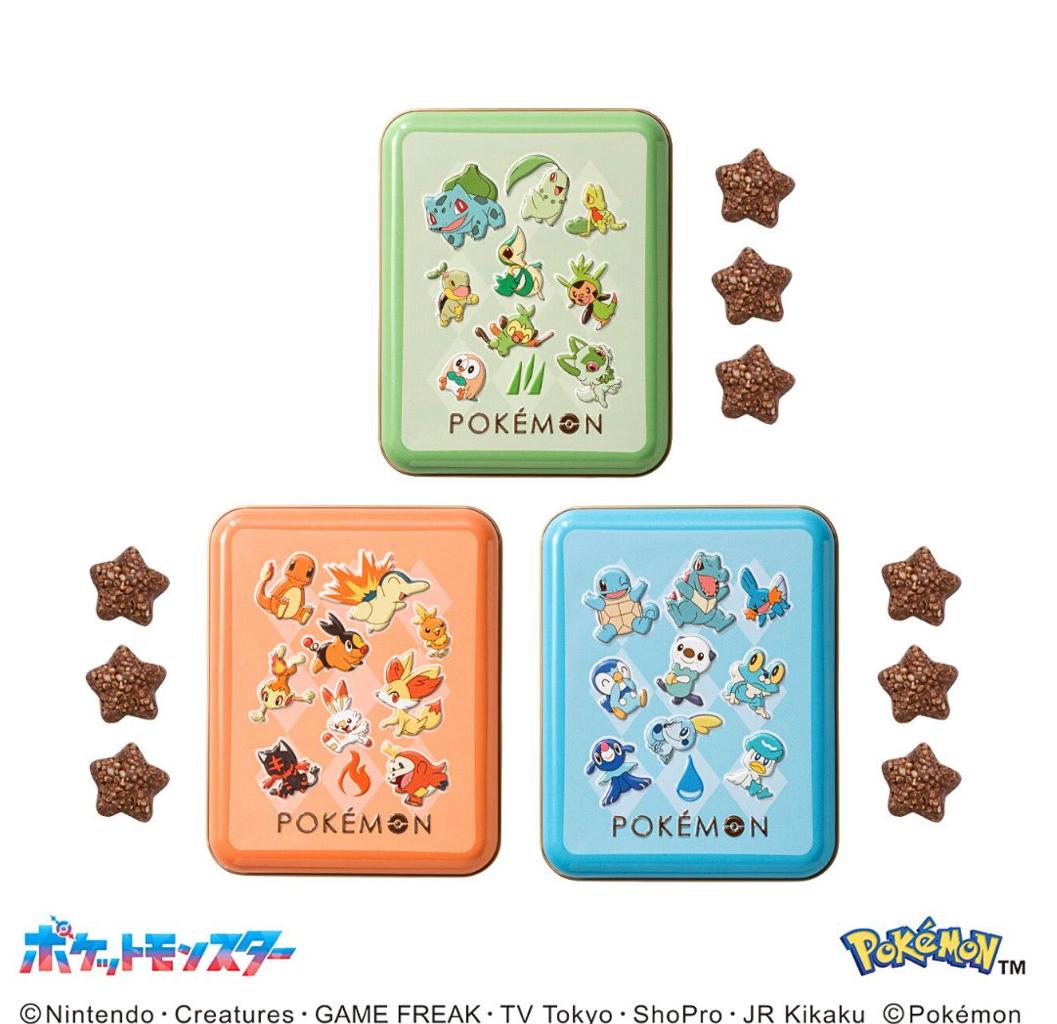 旅立ちの3匹のポケモンをタイプ別にデザインしたミニ缶にクランチチョコを詰め合わせました。