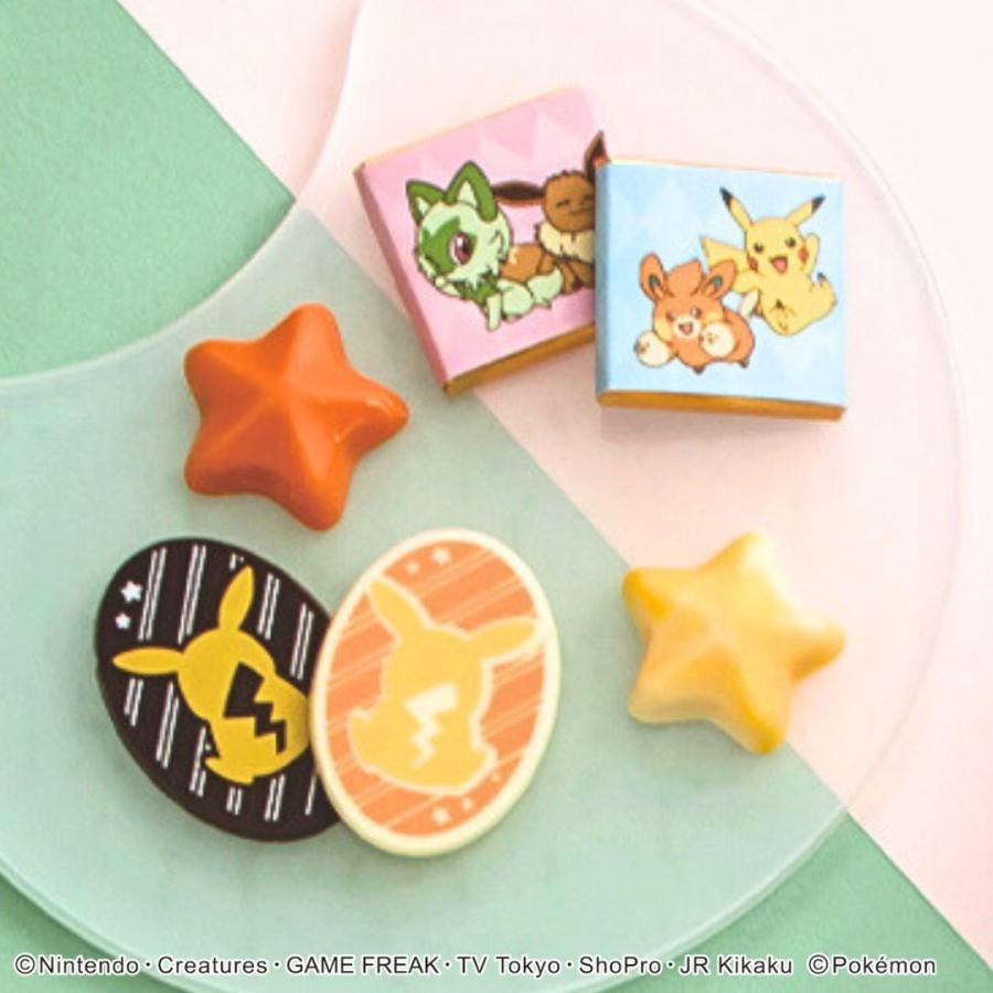 ホワイトチョコで仕上げたクリーミーな甘さのピカチュウ型チョコやニャオハ型チョコを中心に、ホワイトチョコ&スイートチョコのイーブイ型チョコ、甘さ控えめなスイートチョコを使用した後ろ姿のピカチュウデザインのチョコ、キャラメルの甘さに塩味がアクセントのモンスターボールのデザインのチョコ、オレンジ(*)とレモン(*)の爽やかな風味が広がる星型チョコなどを詰め合わせました。(*)…フルーツ香料使用 お酒不使用です。