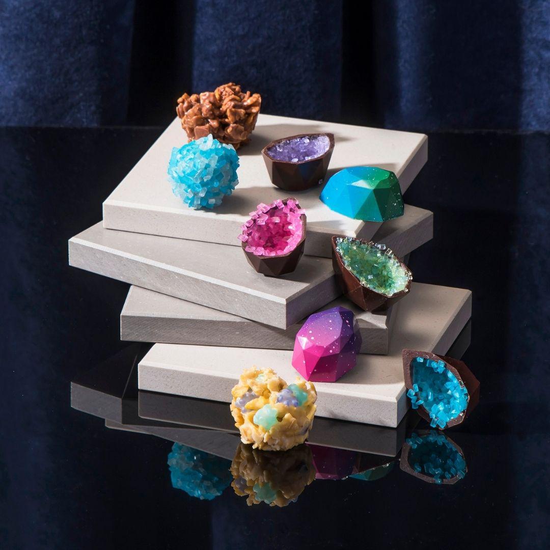 宇宙の彼方に想いを馳せて、惑星の結晶をイメージした美しい宇宙鉱物たちをチョコレートで表現しました。