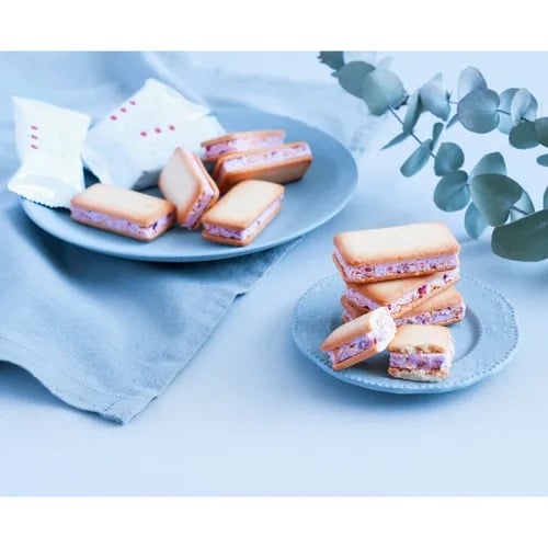 あまおう苺パウダーとラズベリーのフリーズドライが入ったホイップチョコを、芳醇なバターの香るクッキーでサンドしました。サクサクとした食感が魅力のあまおうバターサンド。