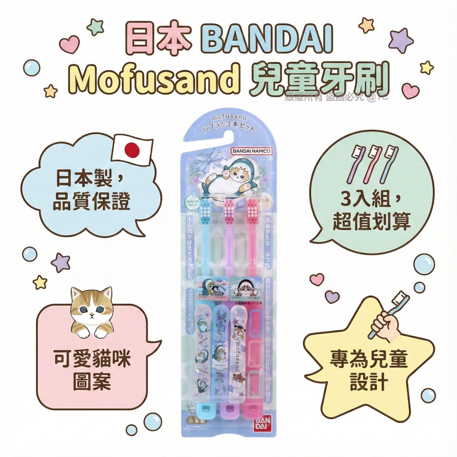 【日本製造 BANDAI Mofusand 兒童牙刷 (一盒3支)】