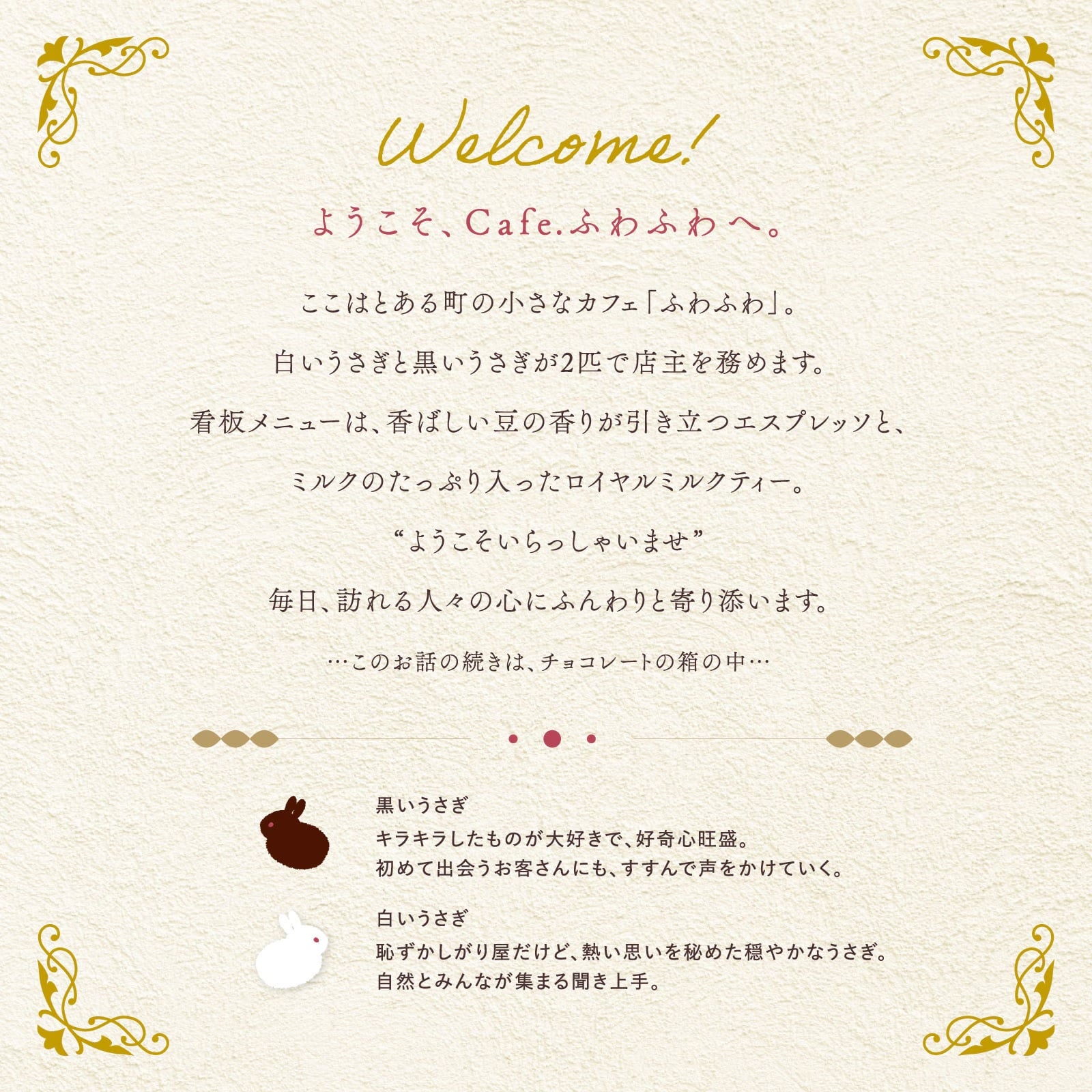 白いうさぎと黒いうさぎが店主をつとめる、小さなカフェ「ふわふわ」。訪れる人々の心にふんわりと寄り添う、2026年注目のフランス屋製菓 新ブランドです。カフェメニューからインスパイアされた、コーヒーや紅茶の香りを活かした特製チョコレートをお届けします。