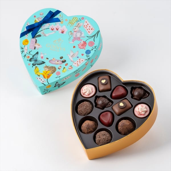 ティーパーティを彩る紅茶やカップケーキなどをイメージした限定チョコレートとトリュフなどを、物語のシンボルのトランプやティーセット、チェシャ猫や白うさぎ達をちりばめたハート形パッケージに詰め合わせました。