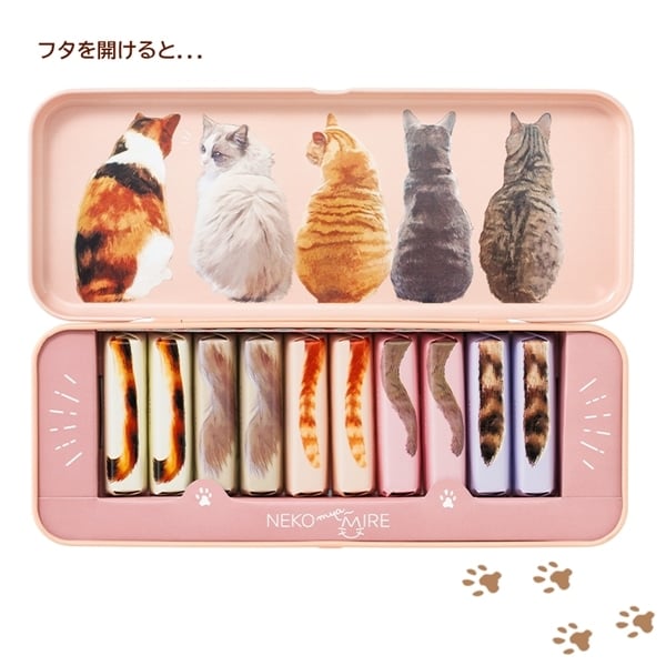 おすわりしてこちらを見つめている猫ちゃんたちが大集合!中には、チョコレートクリームとストロベリー味2種類のショートバーチョコレートが入っていて、1本1本にしっぽがデザインされた、にゃんともかわいい商品です。