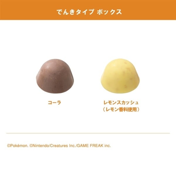 ピカチュウやプラスル、マイナン、デデンネなどのでんきタイプのポケモンがデザインされたボックスにコーラ味とレモンスカッシュ味のはじけるキャンディ入りチョコレートを詰めました。