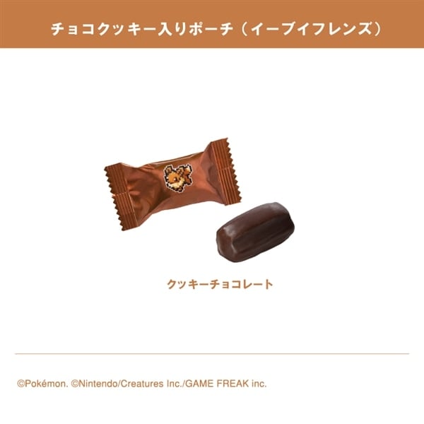 イーブイとその進化形であるブラッキーやグレイシア、ニンフィアたちを表裏でデザインしたポーチに、チョコクッキーを詰め合わせました。モンスターボール型のチャーム付きです。