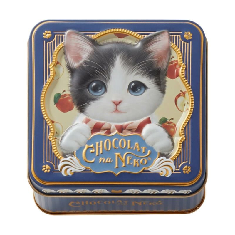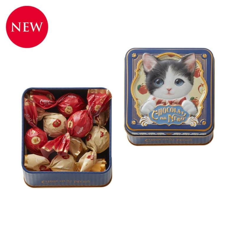 気分屋でやんちゃな白黒ハチワレ猫を描いた、落ち着いたネイビー色の缶には、アップルとキャラメルラテ、2種類のトリュフチョコレート入り。
