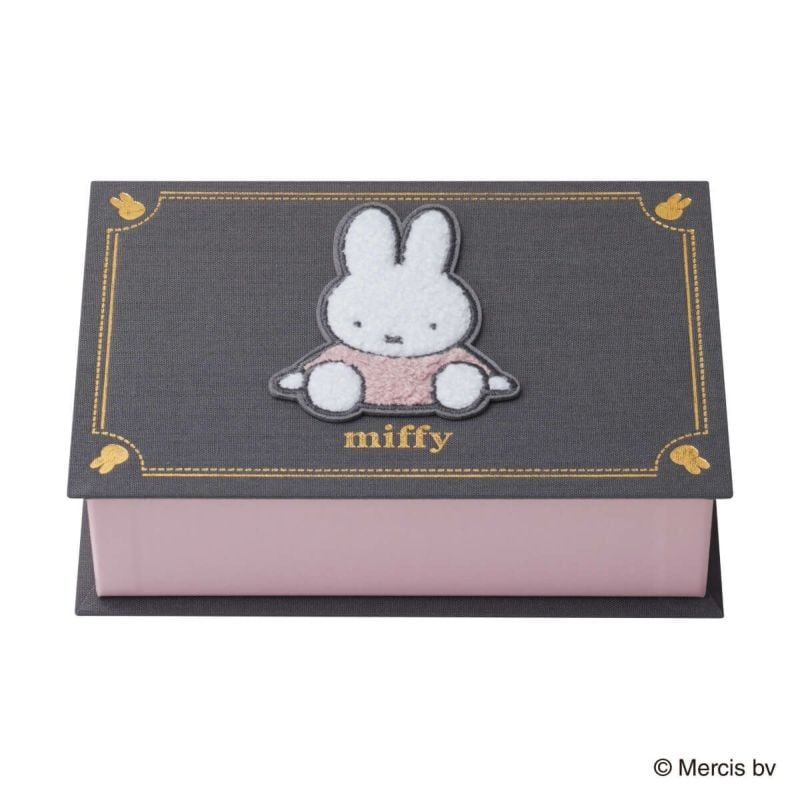 ちょこんとお座りした、愛らしいミッフィーのかたちのチョコレートをふわふわワッペンが付いた、布貼りボックスにずらりとアソート。