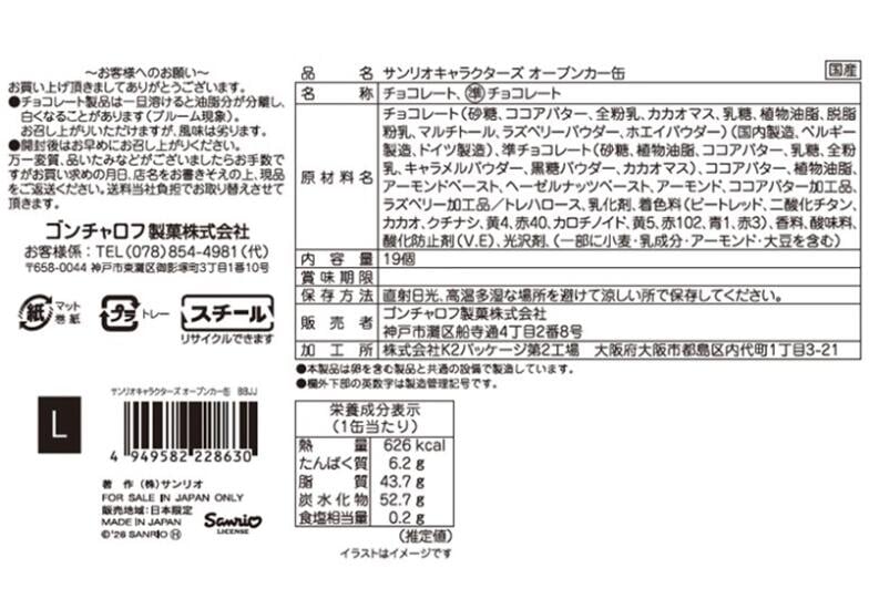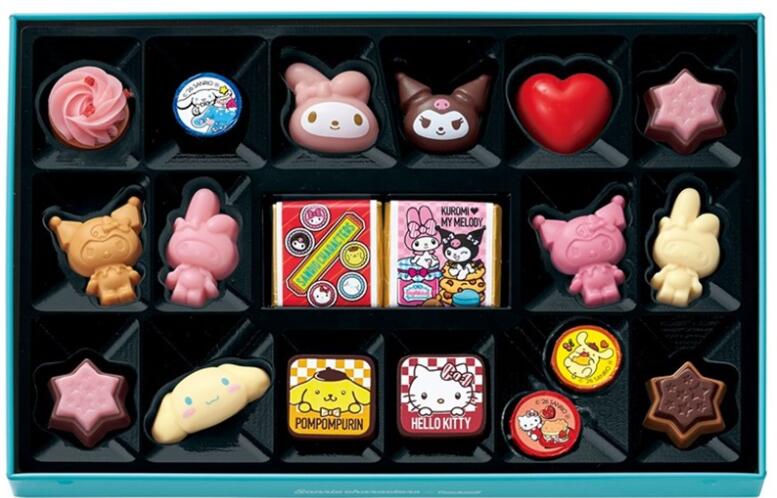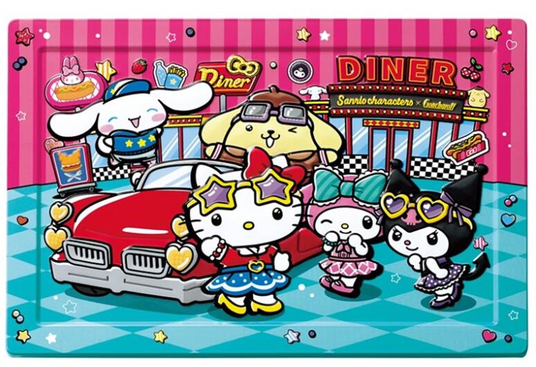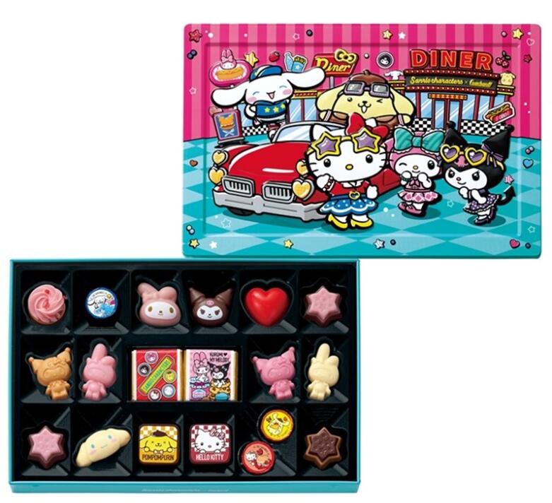 「アメリカンダイナー」前に集まったクロミ・マイメロディ・ポムポムプリン・ハローキティ・シナモロールを 描いた立体缶に、キャラクターの顔型プリントチョコレートをはじめ、キャラクター勢ぞろいのチョコレートを 詰合せました。