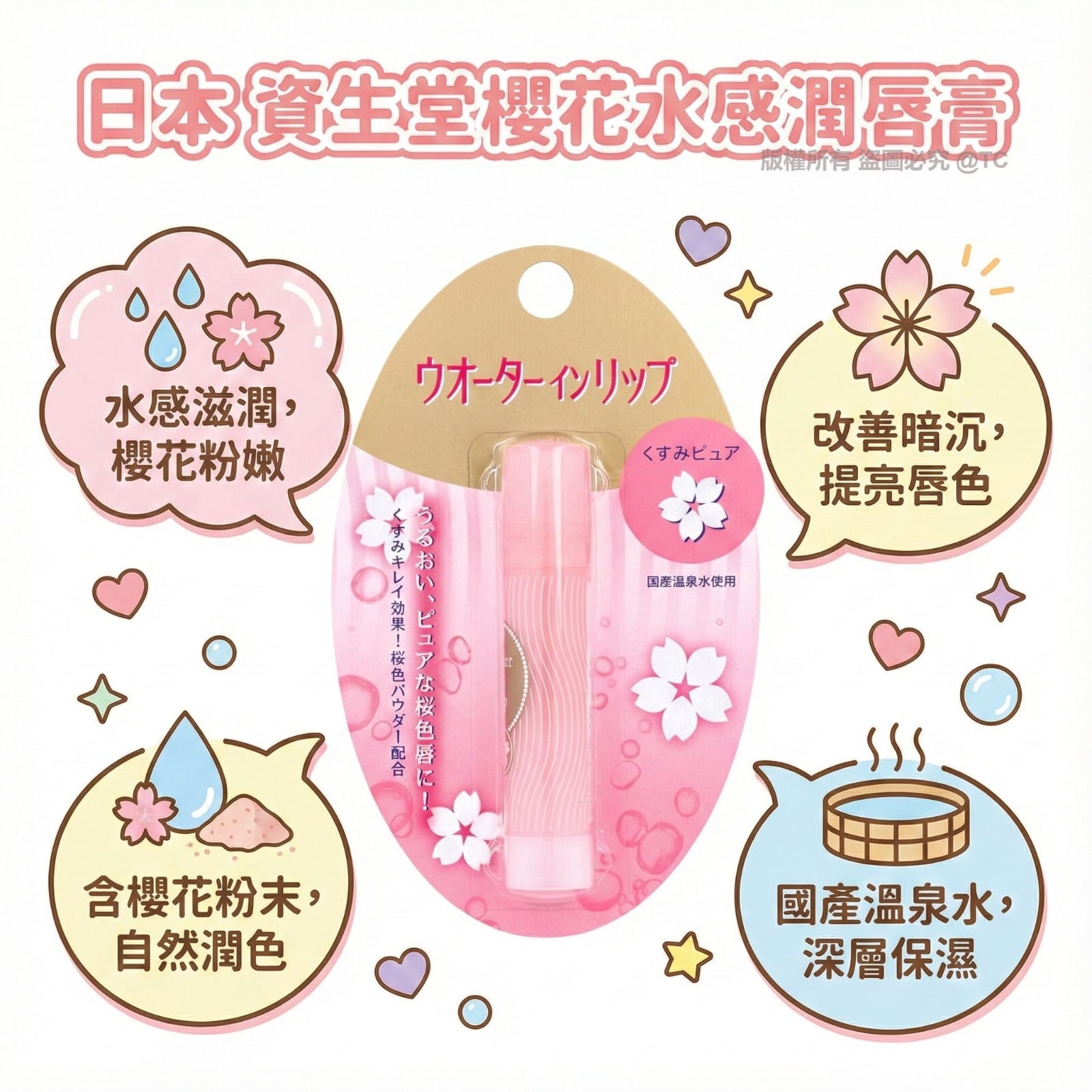 以日本溫泉水與透明質酸精華調配💧滋潤同時修護乾唇🌸融入櫻色礦物粉末令雙唇自然粉嫩有氣色💖質地輕盈滑順塗抹如水般融化💦打造晶透潤澤的「素唇感」💋亦可作為口紅打底💄讓妝效更服貼更柔嫩🌈日常使用隨時補水提亮